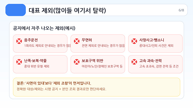 - “음주 초범이면 포함될 수도” → 제외 조항에 걸리는 경우가 흔함